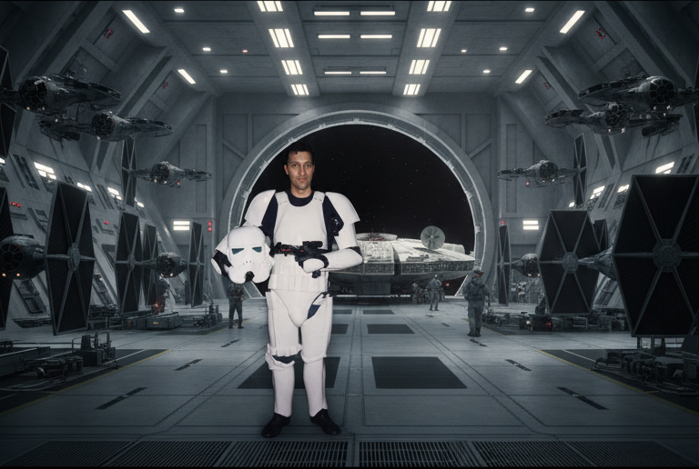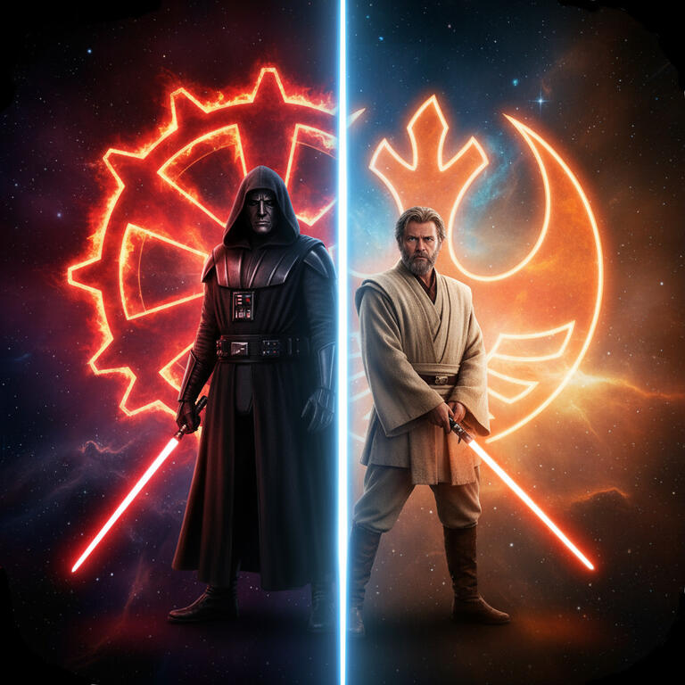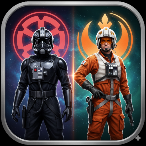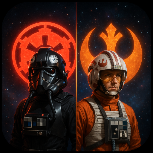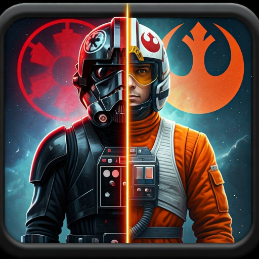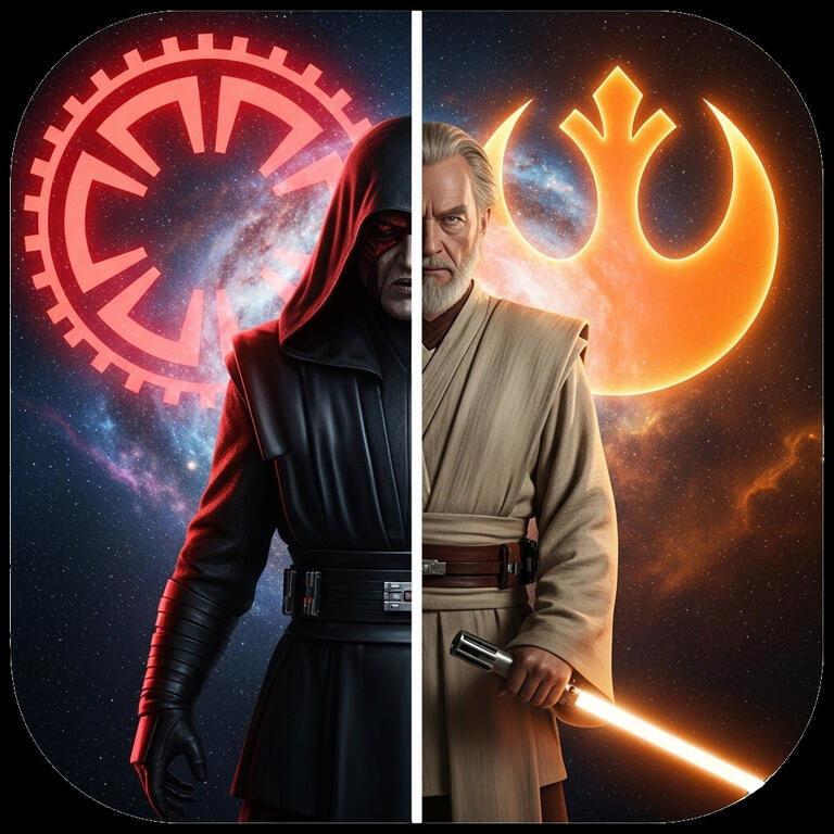 Prompt - A split image icon with a rounded square frame. On the left, a Sith Lord wearing sithoutfit . Behind the Sith Lord is a large, glowing red Galactic Empire cog logo. On the right, a Jedi Master wearing jedioutfit. Behind the Jedi Master is a large, glowing orange Rebel Alliance starbird logo. Both figures stand against a backdrop of a colorful nebula and starlit space, separated by a distinct vertical line. Cinematic lighting, photorealistic, high detail, Star Wars aesthetic.
