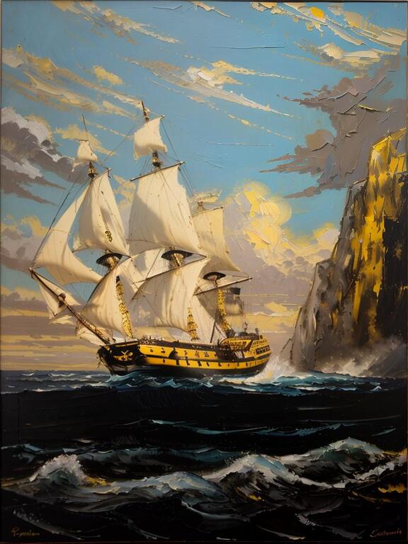 Prompt - 1800 british warship with the hull in the black and yellow paint scheme. From original artwork used as initial image with EpicRealism model and also ControlNet