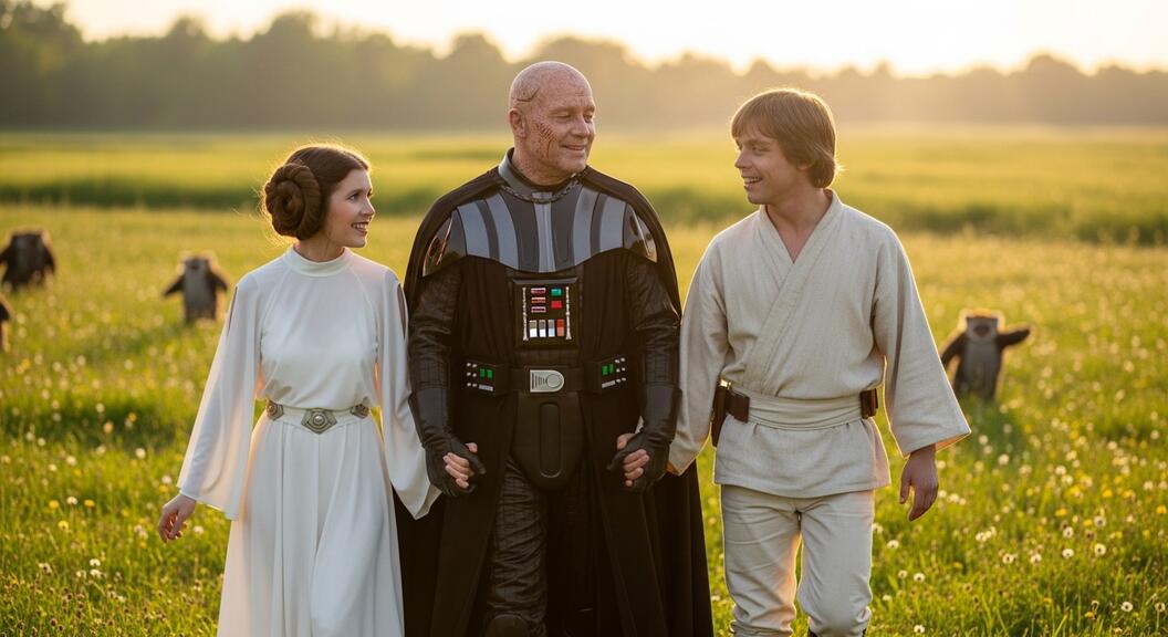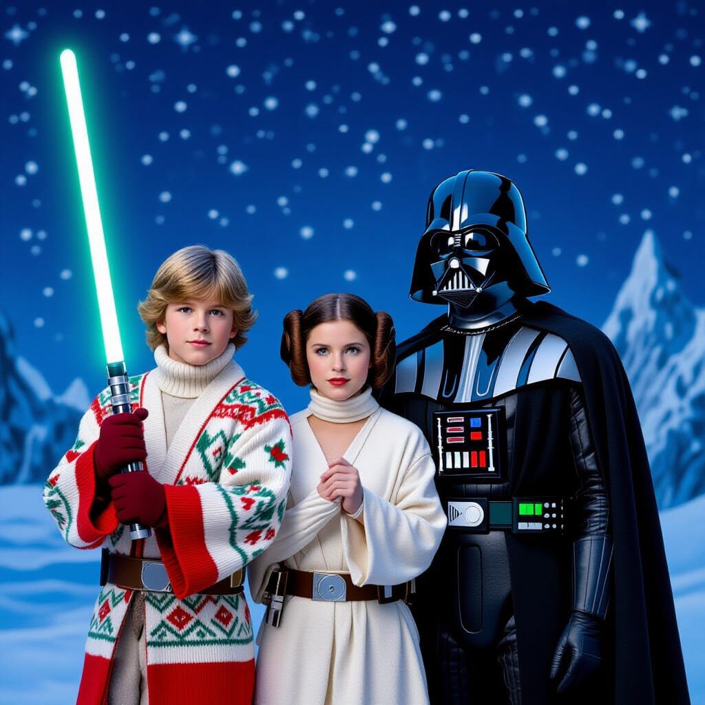 Prompt - one Darth Vader, one Luke Skywalker and one Princess Leia, all one big happy family