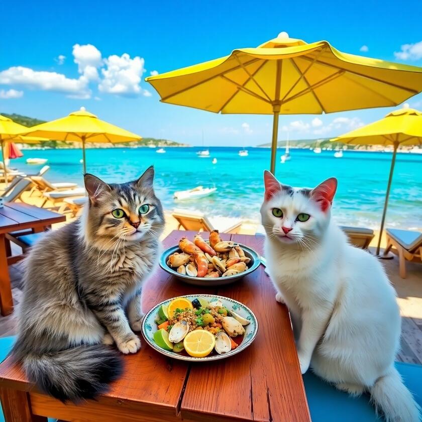 Prompt - Two adorable cats with fluffy fur and bright green eyes, one with a grey coat and the other with a white coat, sitting at a rustic wooden table sharing a plate of fresh seafood, surrounded by vibrant beach umbrellas and lounge chairs, at a charming beach restaurant overlooking the crystal-clear turquoise waters of Skiathos, with a few sailboats and yachts docked in the distance, under a clear blue sky with a few puffy white clouds, and a warm golden light reflecting off the waves, as the cats enjoy their meal together in a peaceful and serene atmosphere.