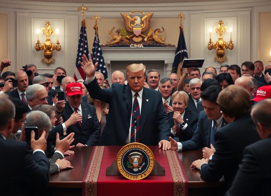 Prompt - Trump, the great and powerful president of america surrounded by a lot of the united people