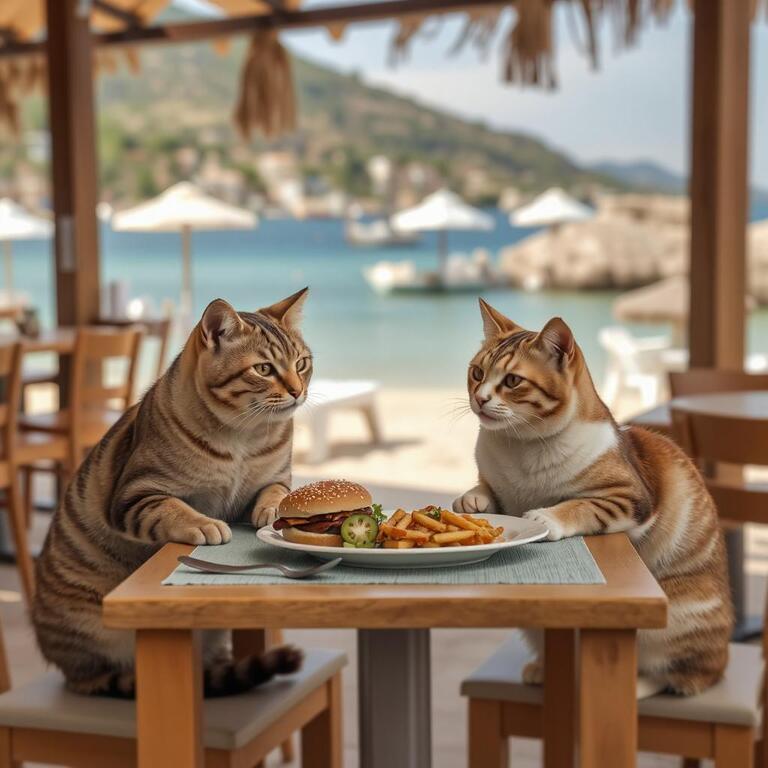 Prompt - Two Cats sitting at a table sharing food at a beach restaurant in skiathos