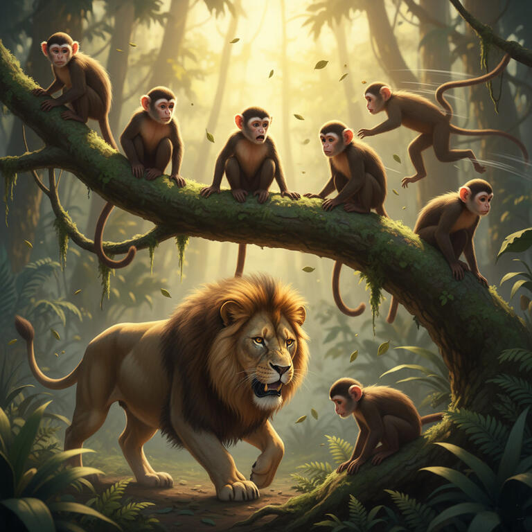 gemini-2.5-flash-image_N_little_monkeys_sitting_on_their_bums_In_the_morning_along_came_the_sun_A_lion.jpg